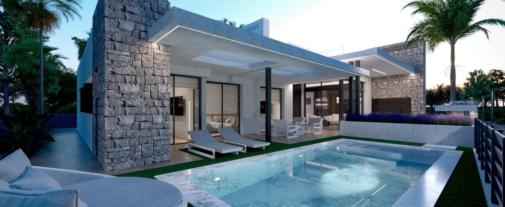 15 New Build independent villas has 3 bedrooms, 3 bathrooms, guest toilet, large living room – kitchen with a wonderful double height, terrace with pool, private solarium with pre-installation for jacuzzi, basement.